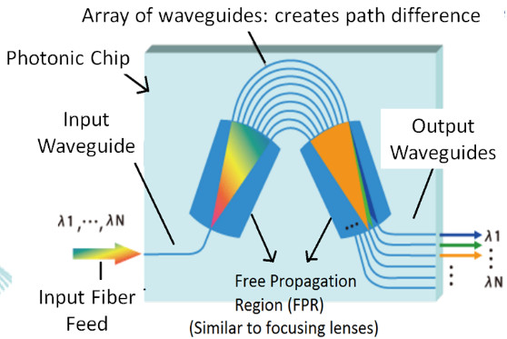 AWG(Arrayed Waveguide Grating)是密集波分复用系统(DWDM)中的首选技术。一组具有相等长度差的阵列波导形成的光栅,使用具有分波的能力。其原理为:含有多个波长的复用信号光经中心输入信道波导输出后,在输入平板波导内发......